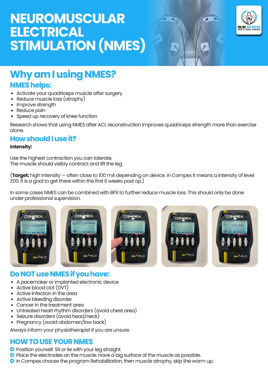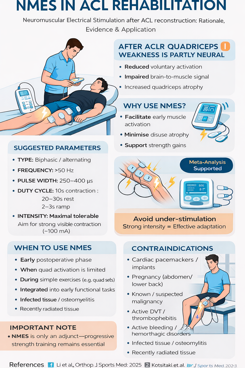 The Aspetar clinical practice guideline on ACL rehabilitation (1) recommends the use of adjunct modalities such as NMES in the early phase, particularly when pain, swelling, and activation deficits limit exercise performance. There is also strong expert consensus supporting its use early after surgery to. Facilitate muscle activation, minimise disuse atrophy and support strength development alongside exercise