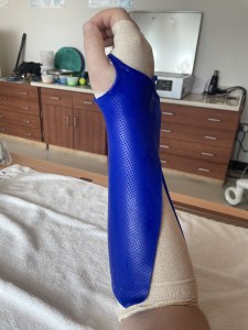 After the Hospital emergency I was given a full cast covering the thumb. With only a X-ray they still did not want to exclude the scaphoid bone fracture, and therefore wanted to cover the thumb. On the 2nd day after the weekend, I had my CT-scan and another x-ray scan in the hospital where I’m working. Here I changed the cast to hard plastic that was formed to my under arm. This also allowed me to move my thumb. At the same time I got a more wrist sporty protector for later purpose.