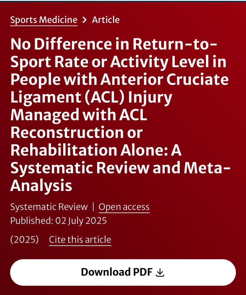 Ref: No Difference in Return-to-Sport Rate or Activity Level in People with Anterior Cruciate Ligament (ACL) Injury Managed with ACL Reconstruction or Rehabilitation Alone.”(Authors: Stephanie R. Filbay et al., Sports Medicine, published July 2, 2025)e